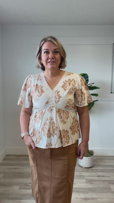 The Bridget Top combines timeless elegance with flattering details. This cream short-sleeve blouse features striking rust florals that add warmth and dimension, while the delicate lace trim brings refined sophistication. The V-neck and flutter sleeves create a graceful silhouette, and the peplum waist adds subtle shape. An elastic back waist ensures a comfortable fit all day long. Perfect for layering or wearing solo, this versatile piece transitions effortlessly from casual to dressy occasions.