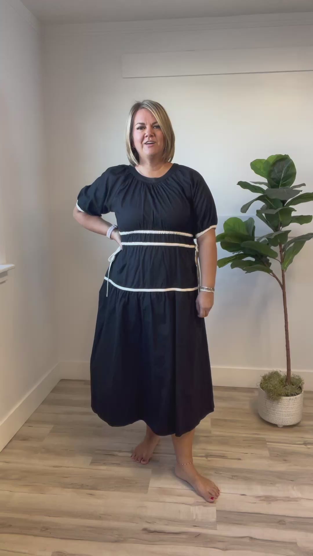 The Brynn Midi dazzles in black with contrasting cream trim on the sleeves, waist, and skirt, adding a fun pop of detail. A round neck with a band keeps the look polished, while ties at the waist let you adjust your silhouette. The large ruffle tier brings playful movement to every step, and its unlined design keeps things light and breezy. Perfect for a cheerful day out or a casual evening!