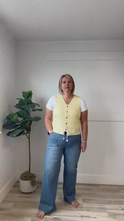 Escape to your own personal cabana in these breezy wide-leg pants! Crafted from lightweight denim in a cheerful medium wash, they feature a high-rise cut with a banded waist and adjustable drawstring for the perfect fit. Playful pinstripes add a fun vacation vibe to your everyday wardrobe. Comfortable, stylish, and ready for adventure—whether you're lounging poolside or exploring the town.