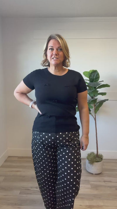 The Callan Sweater Top features playful bows on a knit trellis background, adding a charming twist to a classic black, short-sleeve design. With its comfy crew neck and simple, yet elevated, style, it’s perfect for turning everyday looks into something special. Not a lot of stretch to this top, please check the Size Chart for your fit!