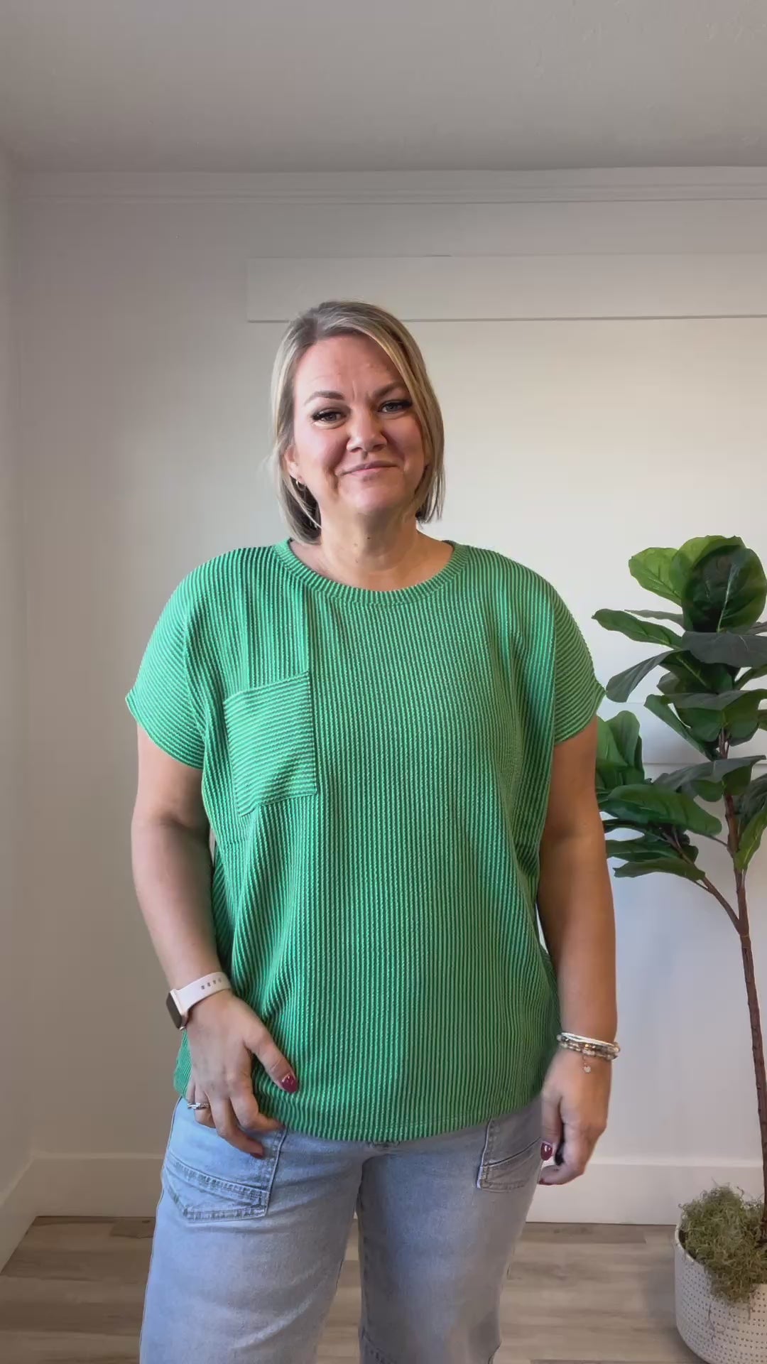 The Chris Top brings a fun pop of Kelly green to your wardrobe with its playful ribbed texture and dolman sleeves. Featuring a handy pocket and a relaxed straight hem, this short sleeve top effortlessly combines comfort with a splash of vibrant style. Perfect for keeping things light and lively!