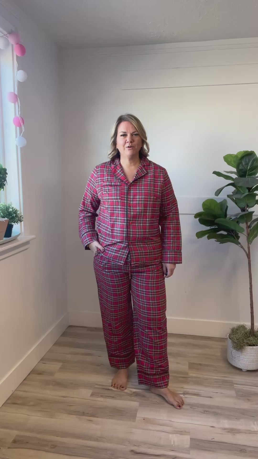 Get cozy and festive with the Christy Pajamas, featuring a classic red plaid top and pants. The long-sleeve shirt with collar adds a touch of timeless style, while the elastic waist and sewn-in cuffs on the pants ensure a comfortable, snug fit. Perfect for holiday mornings or lounging with joy, these pajamas bring fun and cheer to your seasonal wardrobe.