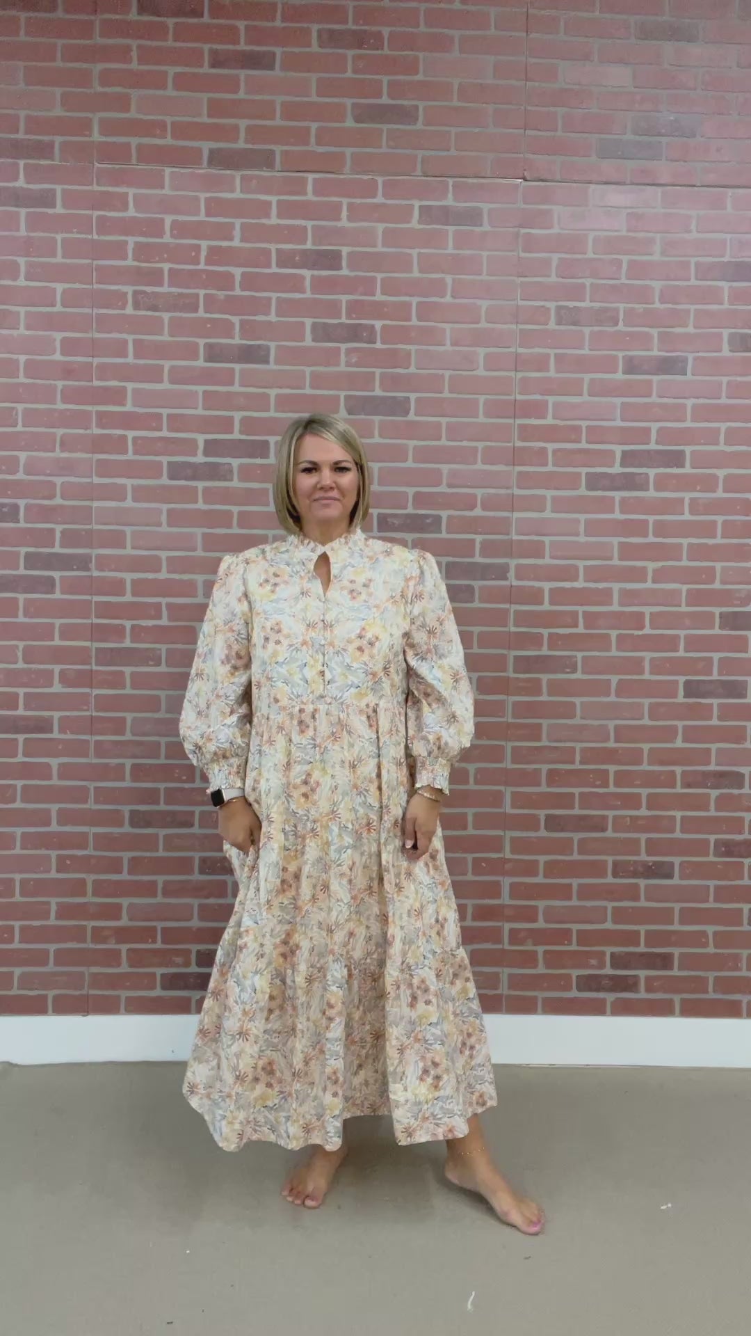 Elevate your wardrobe with the Clarisse Maxi, a cream tiered dress adorned with delicate rust, amber and gray florals. Featuring a button-up top with fabric-covered buttons, a mandarin collar with soft ruffles, and long puff sleeves finished with smocked cuffs, this fully lined dress offers both comfort and style. Perfect for any occasion, its elegant details and flowing silhouette create a timeless look you’ll love to wear.