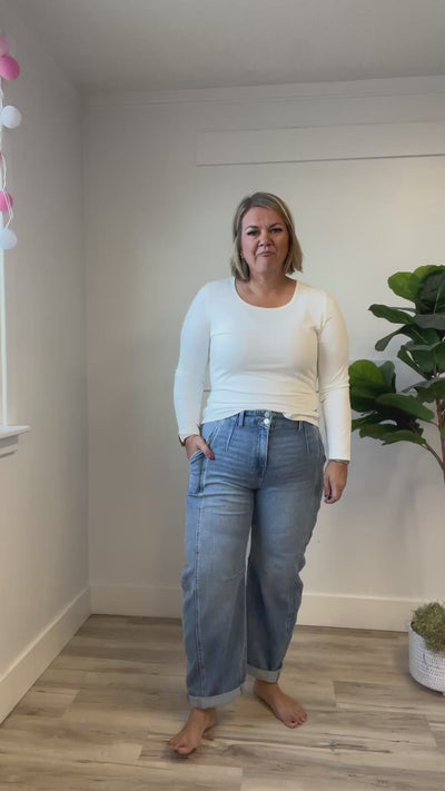 The Coronado Beach jeans bring playful style to your everyday wardrobe with a flattering mid-rise fit and a unique barrel leg silhouette. Featuring a medium wash and charming double roll hems, these jeans are accented by fun seam details, darts for shape, and handy slant pockets—perfect for strolling your favorite spots with a touch of personality.