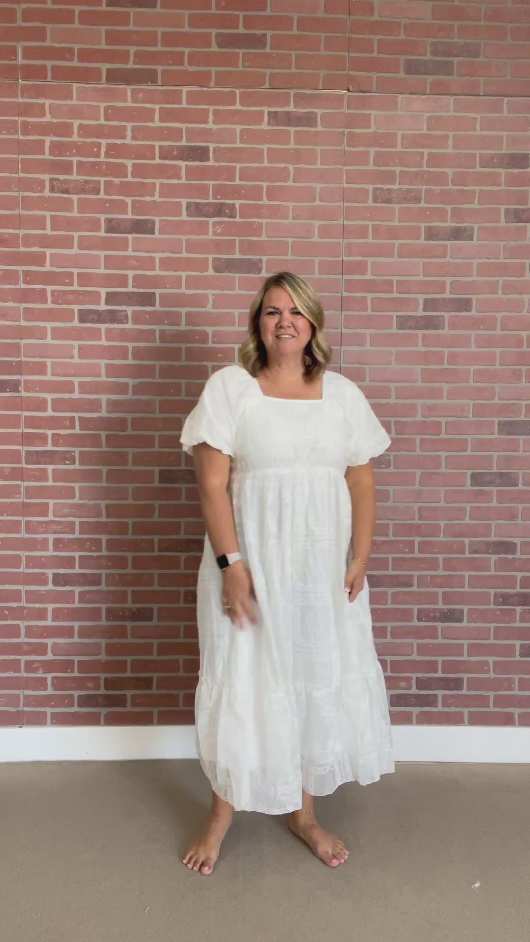 The Elaine Maxi exudes refined elegance with its delicate ivory eyelet fabric and thoughtfully designed silhouette. Featuring graceful balloon sleeves and a sophisticated square neckline, this dress offers both comfort and style with its discreet elastic elements. The fully lined construction ensures a luxurious feel against the skin, while the feminine ruffle hem creates a flowing, sophisticated movement as you walk.