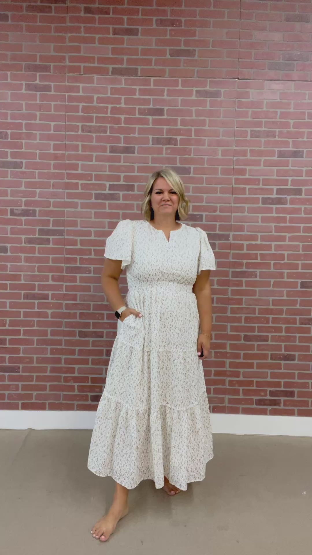 This beautiful Elowen Maxi features delicate flutter sleeves and an all-over embroidered ivory fabric adorned with tiny florals. Its tiered design and smocked waist create a flattering, silhouette, while the pockets and full lining ensure a comfortable feel. Perfect for special occasions or adding a touch of elegant whimsy to your day.