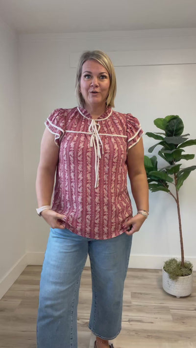The Emberly Top blends playful charm with effortless style. Featuring short, double ruffle sleeves and a tie front with contrasting cream trim, it adds a flirty touch to any outfit. Its unique floral pattern stripe comes in classic black or rich burgundy, making it perfect for mixing and matching.