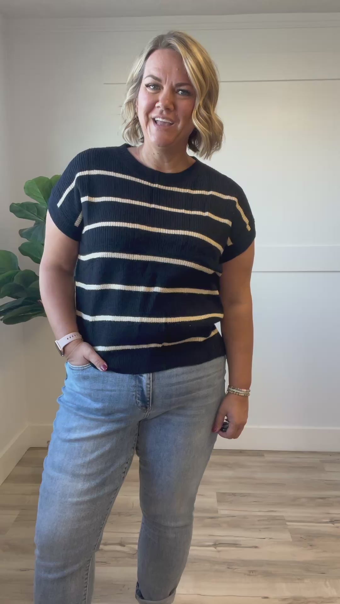 The Etta Top brings a playful vibe with its black base and cream stripes, complemented by cute short cap sleeves. Whether layered or worn solo, it’s a versatile piece that effortlessly brightens up your wardrobe with a splash of fun and style.