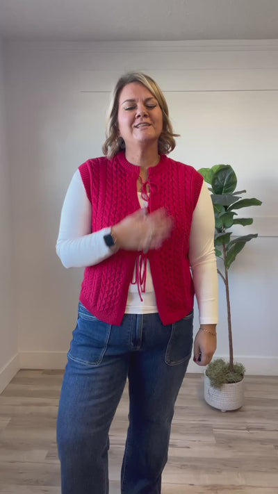 Add a splash of fun to your wardrobe with the Flynn Cable Knit Vest. This vibrant red vest features an open front with playful tie closures, making it a unique layering piece that's as cozy as it is eye-catching. The classic cable knit texture adds warmth and charm, perfect for brightening up any outfit with a cheerful twist.