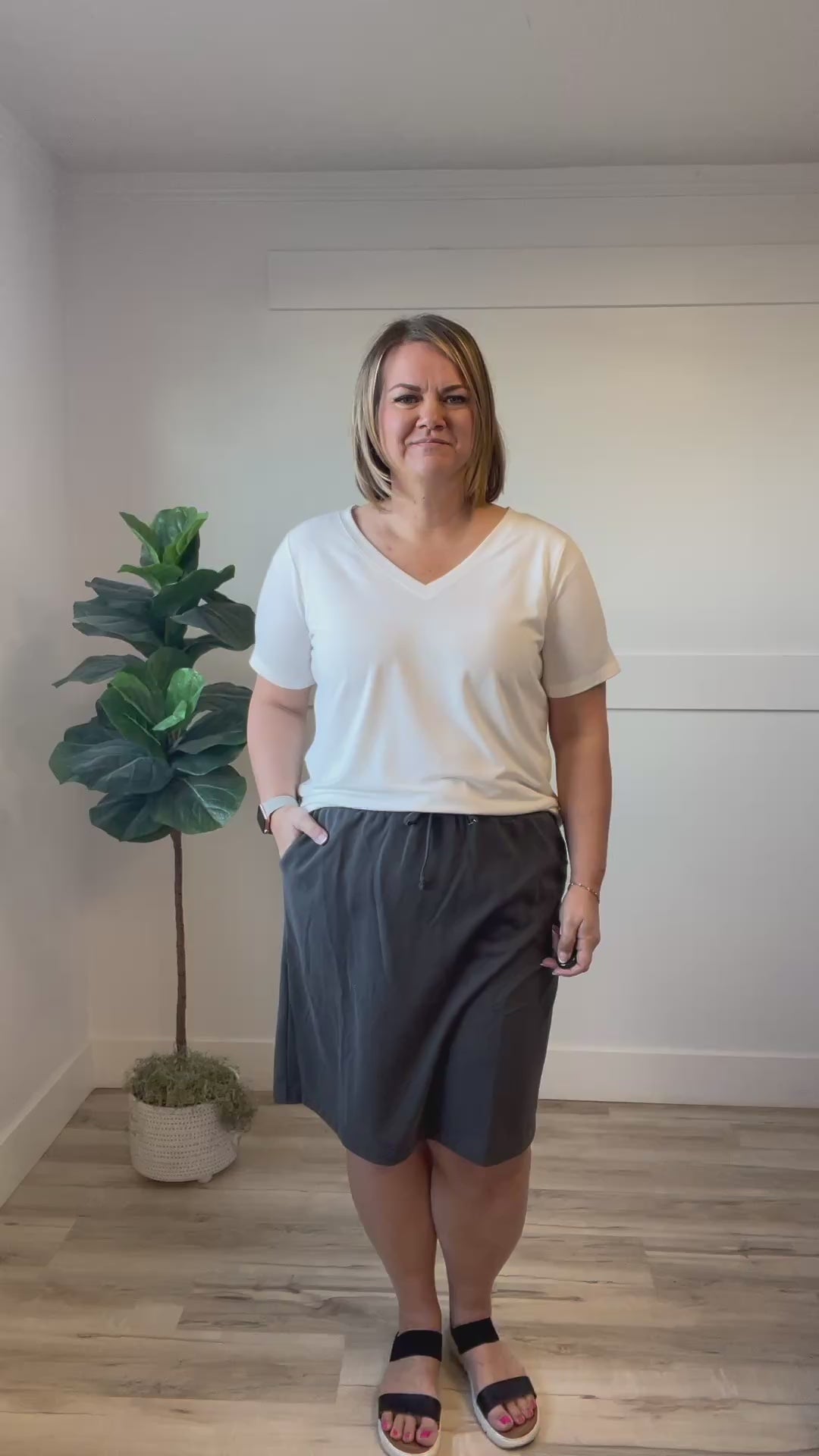 The Geneva Midi Skirt offers a perfect blend of comfort and style with its charcoal solid color and elastic waistband featuring a convenient drawstring for an adjustable fit. Falling just at the knee, it includes seam pockets for everyday essentials. This versatile skirt easily transitions from casual outings to more polished looks, making it a reliable addition to your wardrobe.