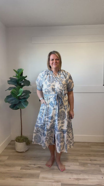 The Gia Midi is your new go-to for effortless style! This charming short-sleeve dress features a striking blue leaf pattern on crisp white, paired with a playful tie neck ruffle and puff sleeves for that perfect touch of whimsy. The faux button-up front and contrasting striped tie belt add vintage-inspired flair, while practical pockets keep your essentials close. Fully lined with elastic cuffs for comfort, this midi dress transitions seamlessly from brunch to evening plans.