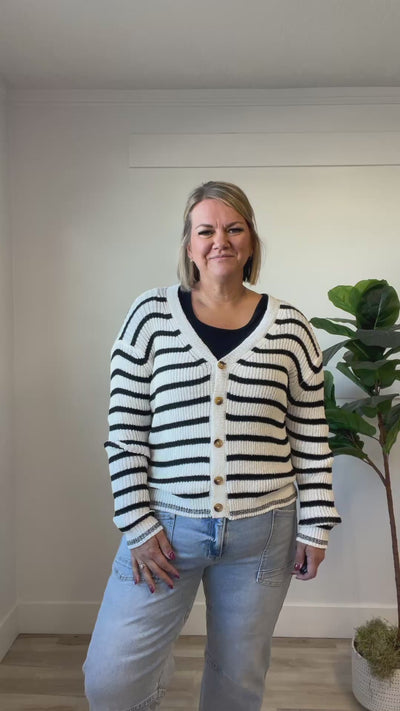 Wrap yourself in the cozy charm of the Greer Cardigan. This unique piece boasts a playful loose knit design, perfect for a laid-back and carefree style. The ivory and black stripes add a touch of whimsy, while the contrasting solid ivory neck and front give it a modern edge. With a half button-up detail, this cardigan is both stylish and comfortable.