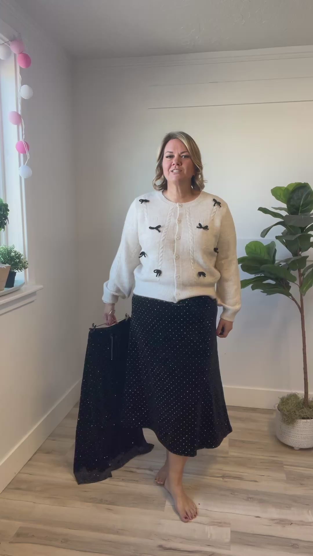 The Halsie Midi Skirt combines effortless elegance with all-day comfort. Crafted from luxurious stretchy black "velvet", this midi skirt features delicate rhinestone dots that catch the light with every movement, adding just the right amount of sparkle to elevate your look. The elastic waist ensures a perfect fit that moves with you, making it ideal for both special occasions and elevated everyday wear. Dress it up or down—this versatile piece transitions seamlessly from day to night while keeping you feeling confident and comfortable.