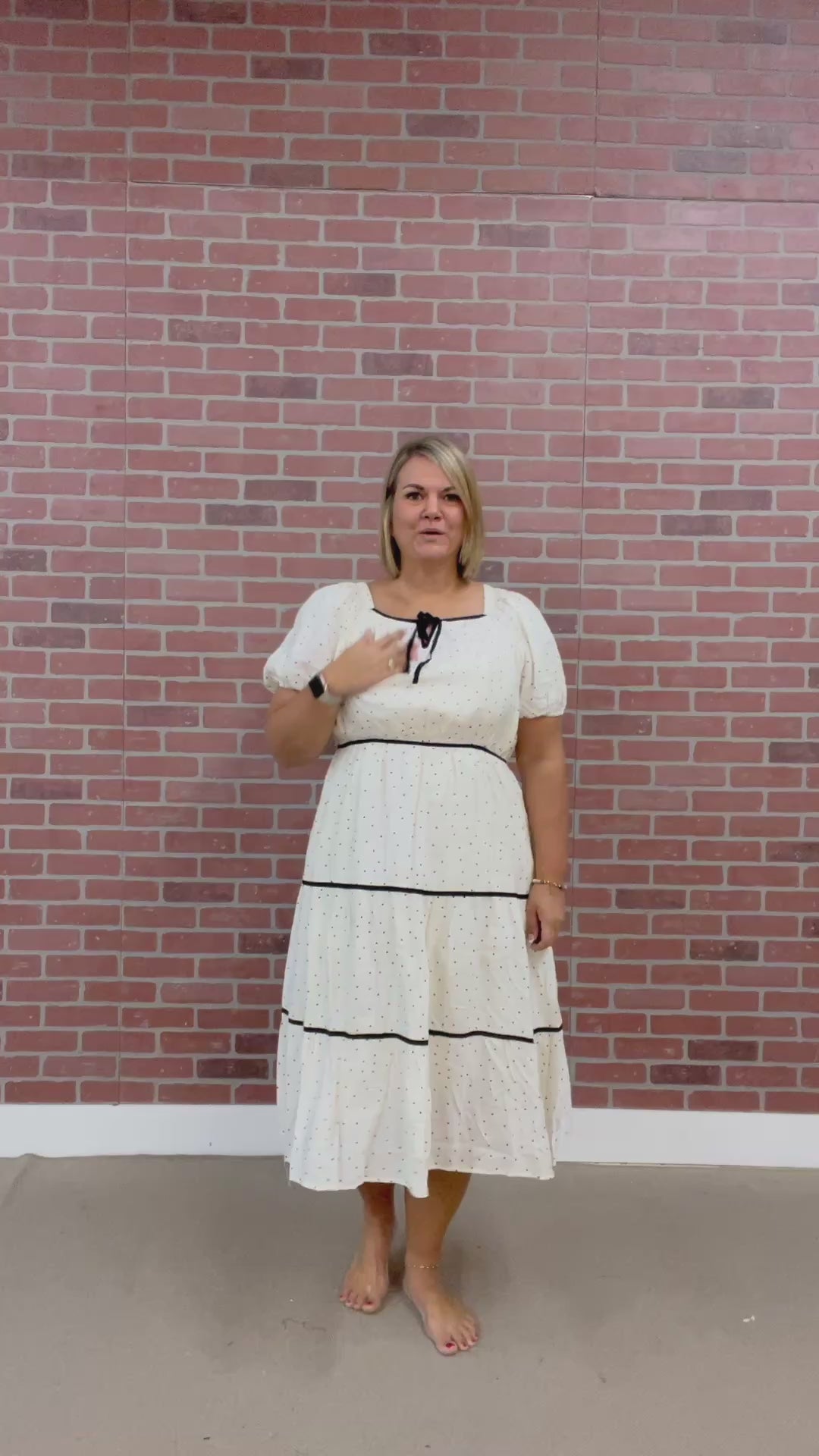 The Helen Midi dress brings playful charm with its ivory fabric dotted in classic black polka dots and accented by chic black trim. Featuring a flattering square neckline and a tie at the neck, it combines style with a hint of whimsy. Its tiered skirt and elastic waist create an effortless silhouette, while handy pockets add practicality. Fully lined for comfort, this dress is perfect for days when you want to feel both fun and fabulous.