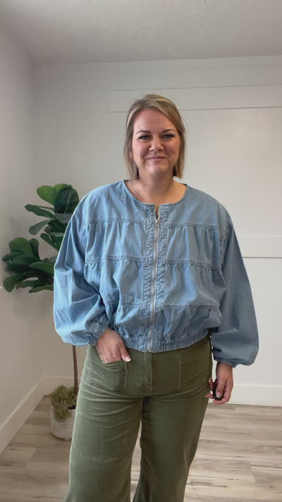 The Hudson Denim Jacket features a light denim fabric with a lightweight feel, perfect for layering in any season. Its gathered tiers and elastic cuffs and waist create a flattering, comfortable fit, while the round neck and zip-up front add to its easy-to-wear style. Seam pockets provide convenient storage without disrupting the unique silhouette. This fun jacket makes a stylish statement while keeping you comfortably covered throughout the day.