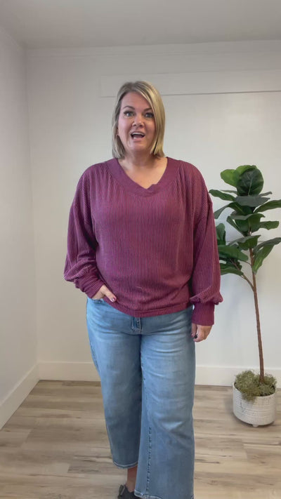 Slip into the Hunter Top in rich burgundy for a perfect blend of comfort and style. Its ribbed stretch fabric hangs just right. The playful V-neck on the front and back, drop shoulder and long dramatic puff sleeves add a flirty touch to your everyday look. Whether layered or worn solo, it’s your go-to for effortless charm.