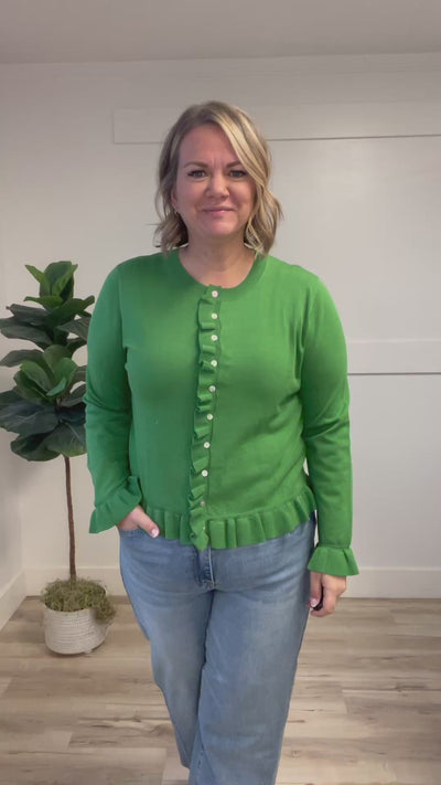 The Jackie Top is a timeless long sleeve cardigan that effortlessly elevates any wardrobe. Crafted from green fine gauge knit, this button-up style offers a refined silhouette with thoughtful details that set it apart. Delicate ruffles frame the button placket, cuffs, and hem, adding feminine charm and visual interest to every wear. The classic round neckline provides versatile styling options—layer it over dresses, pair it with your favorite jeans, or wear it solo for an instantly polished look. Whether you're dressing up for the office or keeping it casual, this cardigan delivers both comfort and sophistication in one beautiful piece.