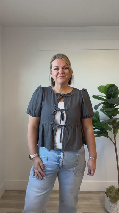 Bring a playful touch to your wardrobe with the Jill Top. Featuring short puff sleeves with elastic cuffs, a flattering round neck, and a tie-front detail, this charcoal denim peplum style adds fun and flair to any outfit. Perfect for a casual day out or a stylish evening look.