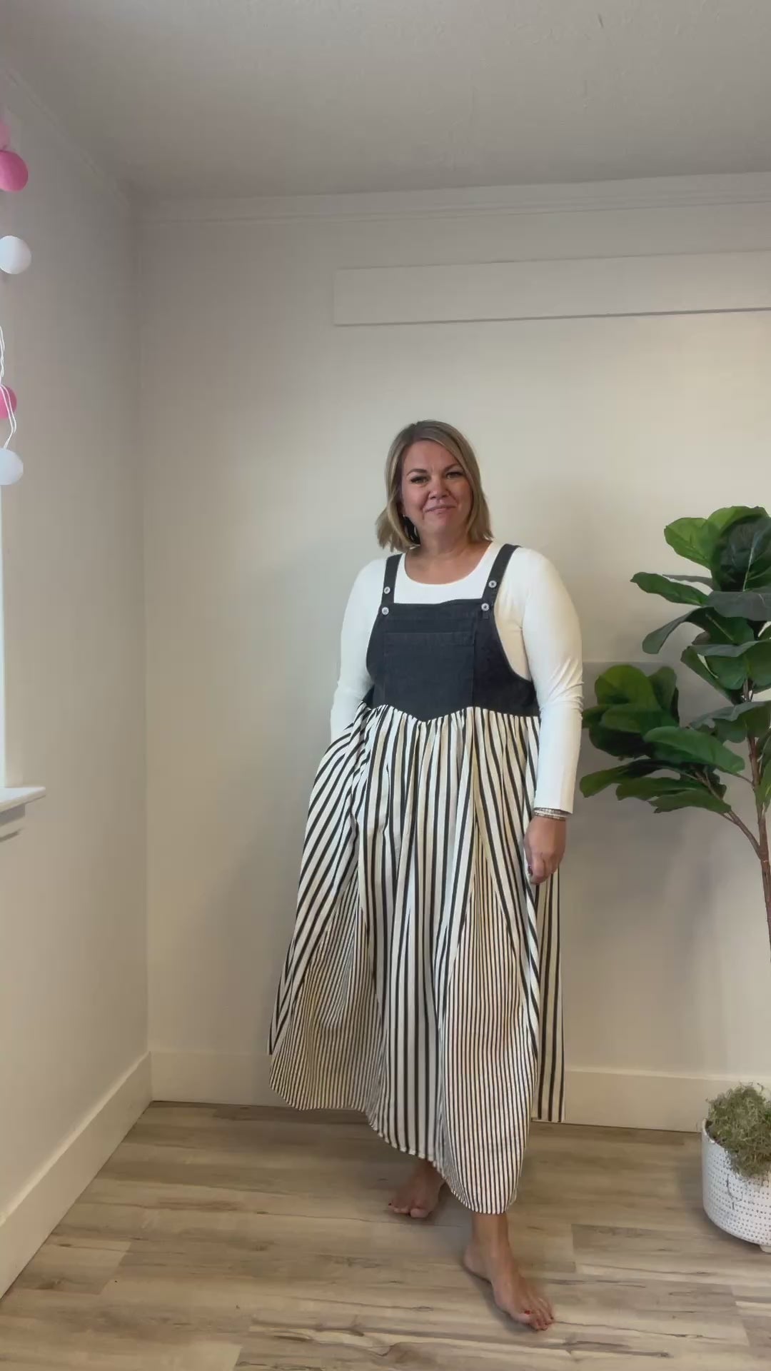 The Joy Midi Jumper combines a chic washed black denim overall top with a flowy, textured striped bottom. Featuring playful mixed fabrics of varying-size black and white stripes, adjustable straps, seam pockets, and a large bib pocket, this jumper perfectly balances structure and ease for a fun, effortless look.