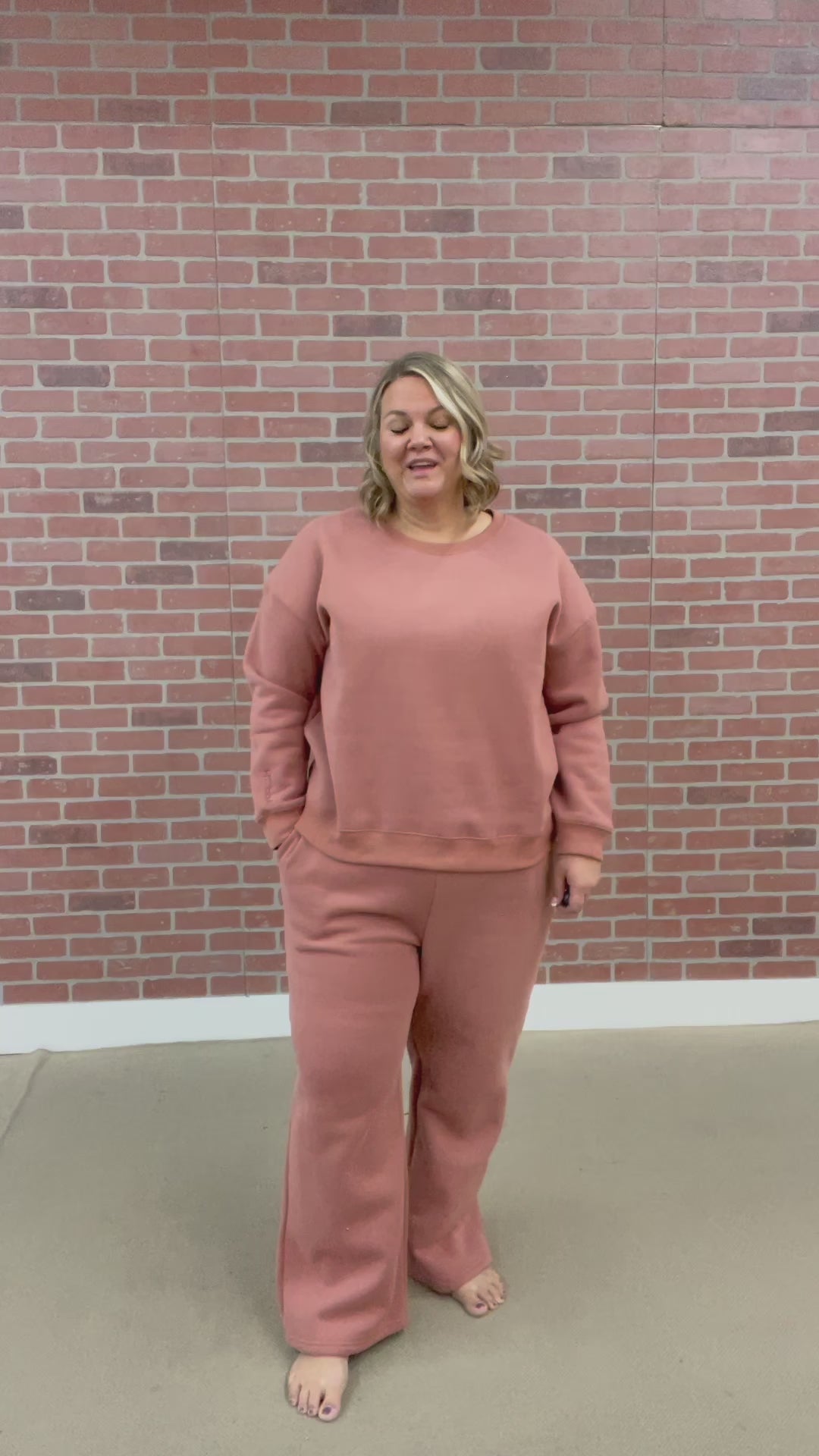 Unwind in style with our Happy Lounge Set. The dusty rose color adds a touch of playfulness while the wide leg provides maximum comfort. The drawstring elastic waist ensures the perfect fit, and the slant pockets on the pants are perfect for storing your essentials. The top is a comfortable long sleeve crewneck. Plus, with the embroidered "H:)PPY" on the sleeve, you'll radiate good vibes all day long.