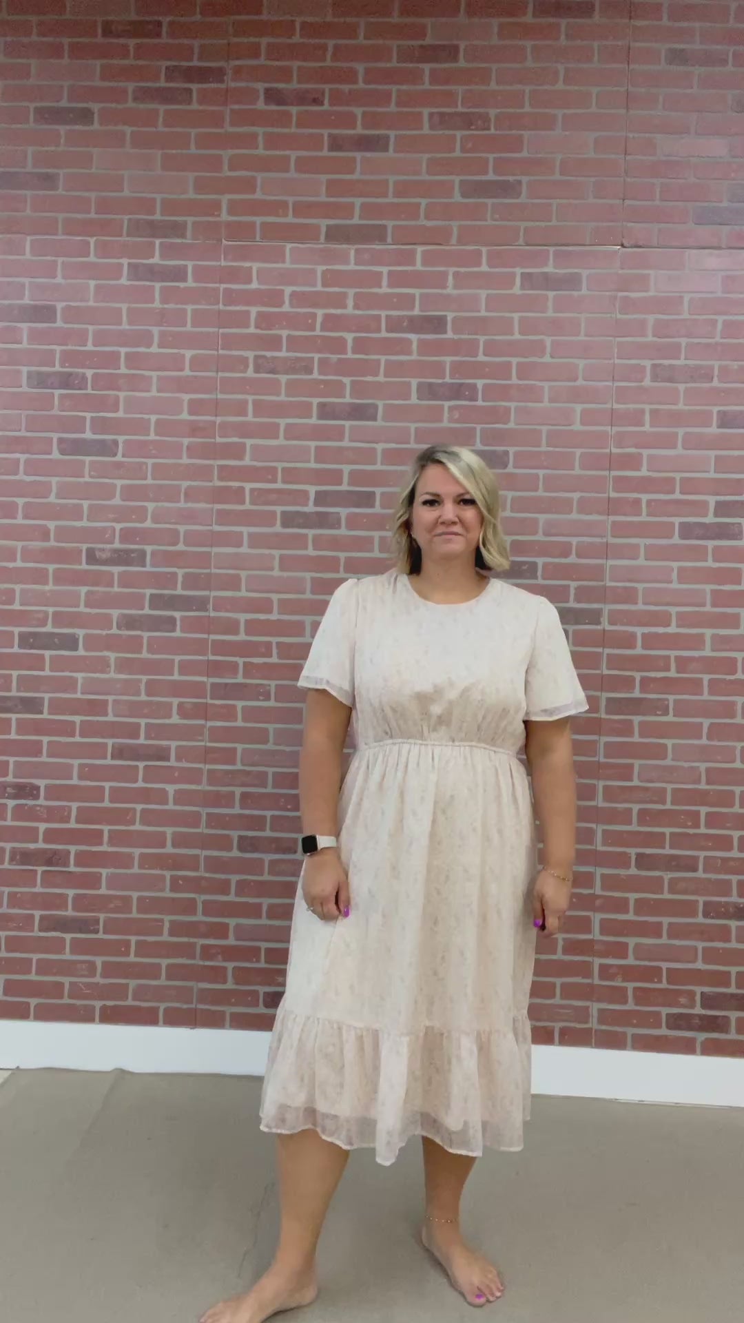 The Kallie Midi dress brings a playful charm with its delicate taupe floral print on an ivory backdrop. Featuring flutter sleeves, a round neck with a keyhole detail, and a sheer overlay, it’s fully lined for comfort. The elastic waist ensures a flattering fit, while the large ruffle hem adds a fun, flirty finish perfect for any occasion.