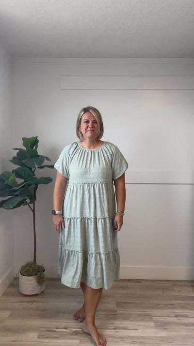 The Katie Midi brings effortless spring style with its charming mint green hue and playful tiered design. Delicate ruffles cascade down each tier, adding texture and movement to this flattering silhouette. The raglan sleeves provide comfortable coverage while the midi length offers modest elegance. Perfect for warm weather gatherings, this piece transitions seamlessly from casual outings to special occasions.