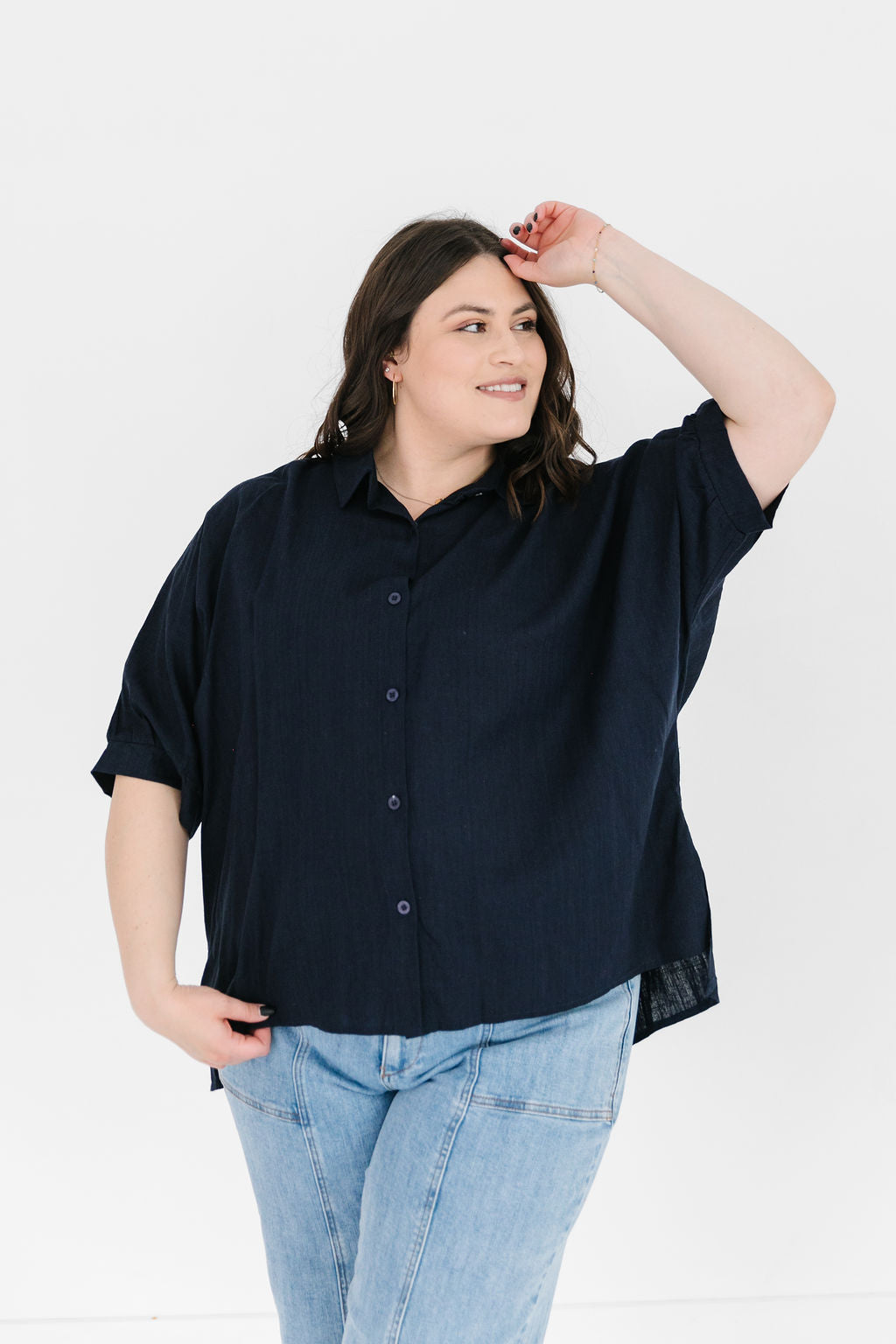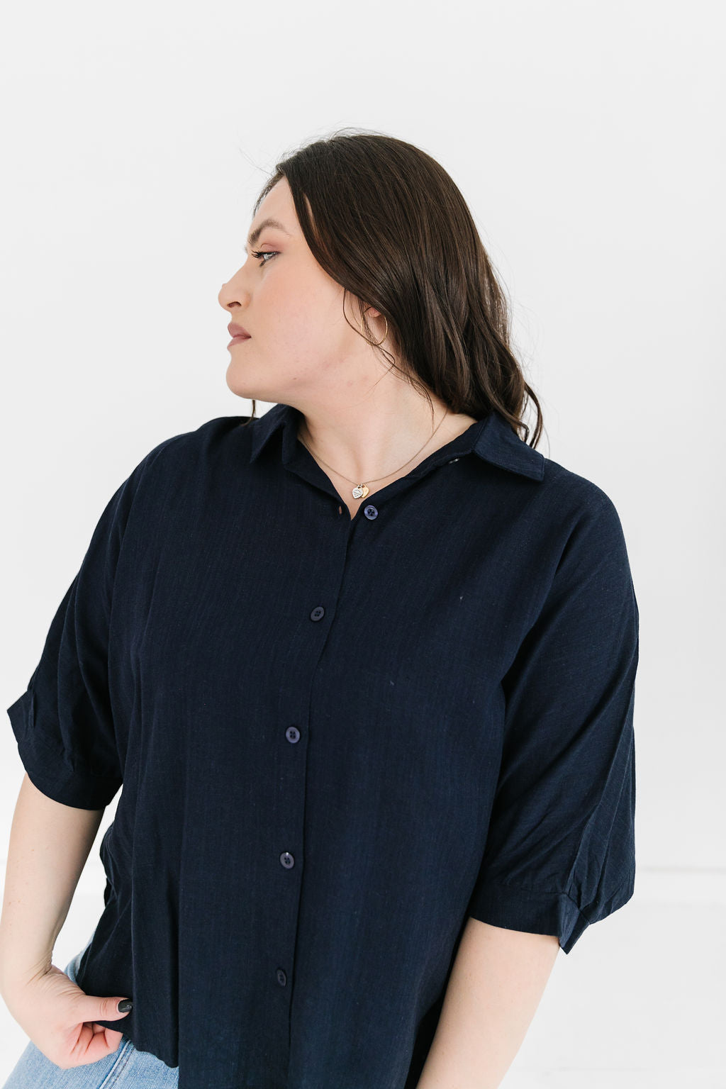 The Katie Top in midnight navy blue features a breathable linen-look fabric that keeps you cool and comfortable. Its oversized fit, short sleeves with banded cuffs, and classic collar create a relaxed yet refined style. The button-up front and yoke detail add subtle sophistication, while the hi-lo hem offers a modern silhouette. Perfect for effortless elegance, this versatile top elevates any outfit with ease.