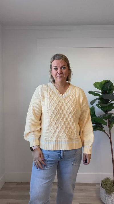 The Kiki Sweater shines in a soft yellow shade with playful peach undertones, accented by crisp white contrasting stripe stitching. Its intriguing pattern and cozy mixed knit front and back make it a standout piece, while the flattering V-neck and long sleeves add effortless charm to your look. Perfect for adding a fun pop of color and soft, cozy texture to any outfit!