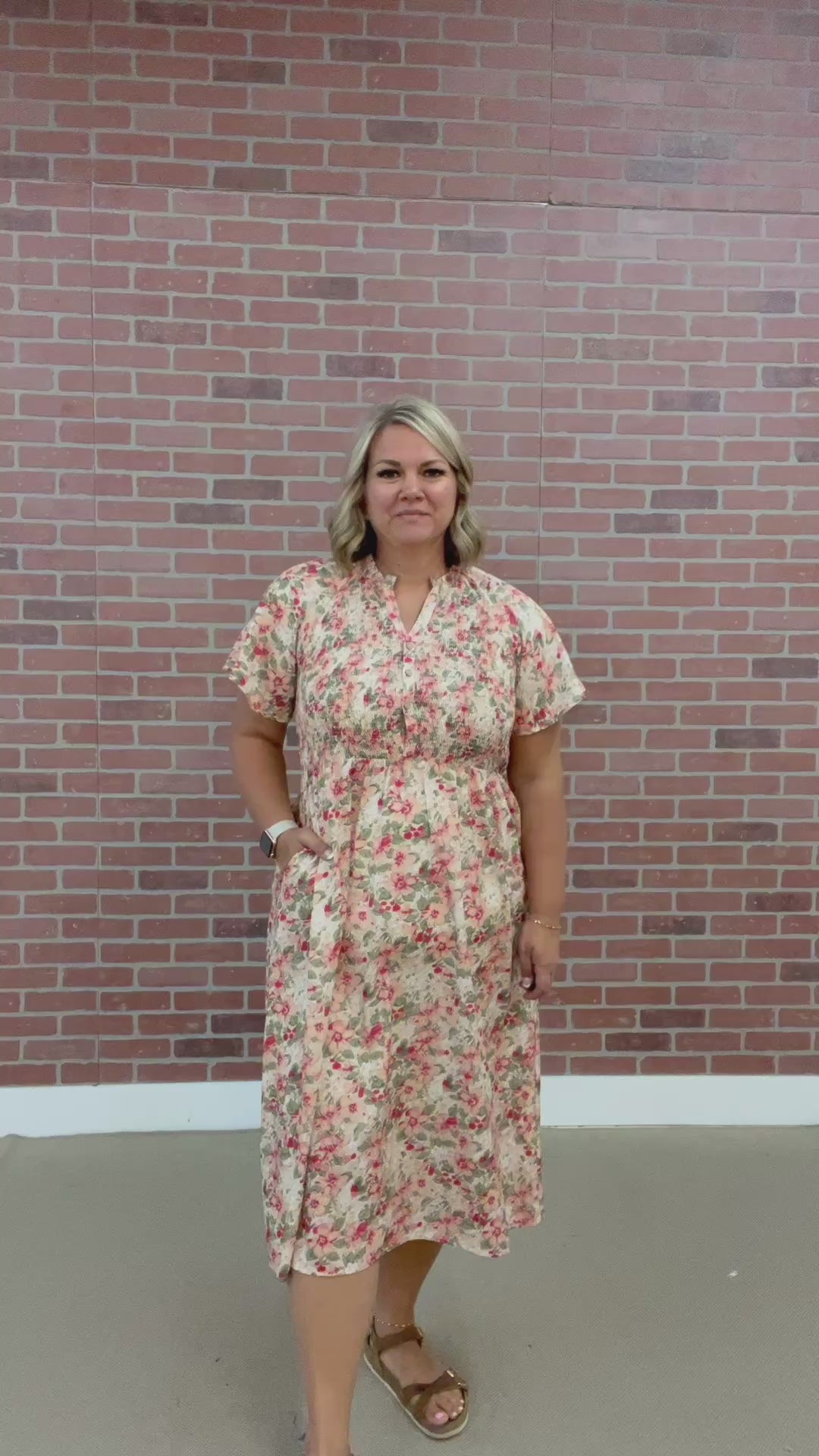 This playful Lana Midi dress features a charming cream base adorned with red and pink florals and berries. It boasts a smocked front, button-up design, and a delicate ruffle collar that adds a flirty touch. Flutter short sleeves and an elastic waist create a comfortable, breezy fit, while seam pockets offer practical style. Perfect for sunny days, this dress is lightweight with no lining, making it an easy choice for effortless, fun fashion.