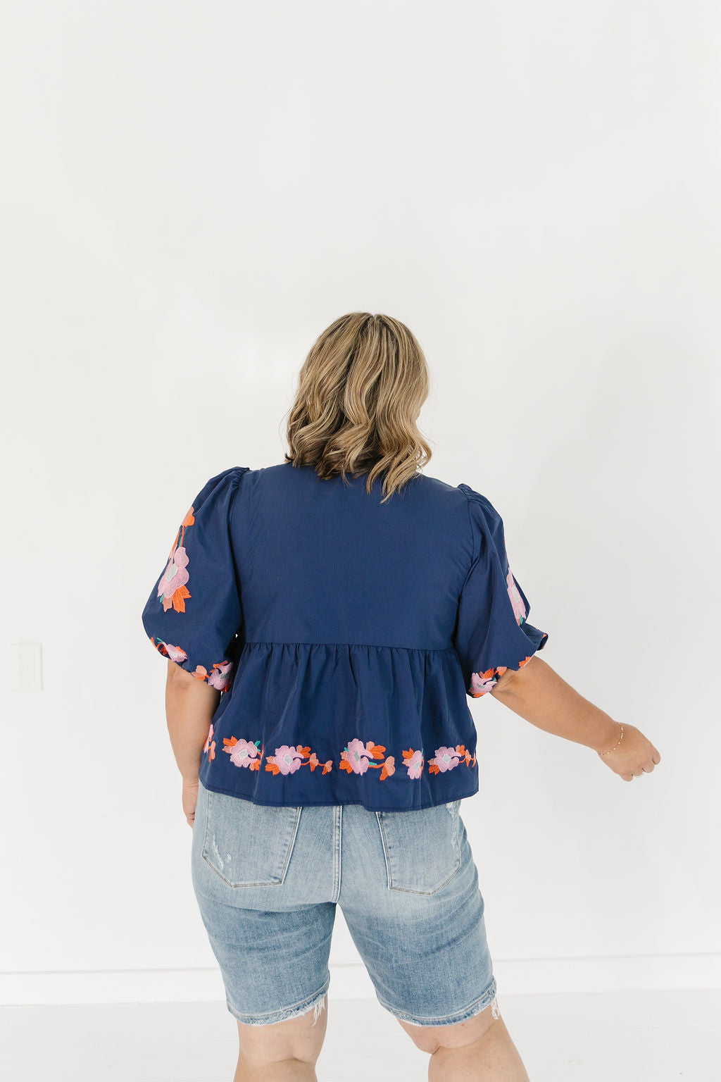 Introducing the Lauryn Top - a must-have for any fashion-forward individual! This navy blue top features stunning embroidered florals and a delicate ribbon detail, adding a touch of elegance to your wardrobe. With a flattering peplum design and charming puff sleeves, it's the perfect combination of style and sophistication. Elevate your look and feel confident in this must-have piece.