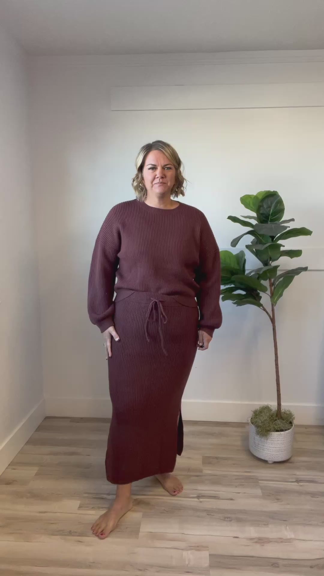 Stay cozy and stylish in the Maple Knit Sweater Skirt- a thick, chunky sweater knit skirt in a rich, deep mahogany hue that feels as warm as autumn itself. This midi skirt shines with an elastic waist and drawstring for comfort and perfect fit. This versatile skirt effortlessly blends with sweaters, blazers and blouses for comfortable chic, making it your go-to for crisp days and cozy nights. Embrace the season with warmth and a splash of color!