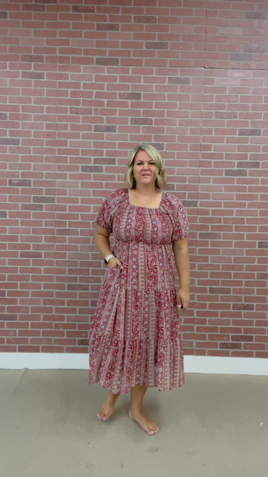 Introducing the Margaret Maxi: the perfect blend of femininity and comfort. This dark red dress features a beautiful print of indigo and taupe florals. The smocked bodice offers a flattering fit while the elastic cuffs ensure all-day wearability. The tiered design adds a touch of whimsy to this lined dress.