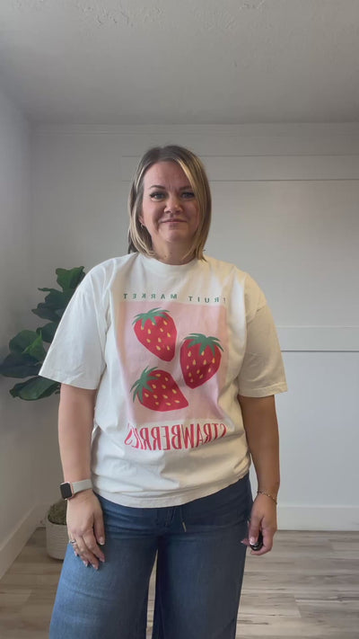 Celebrate summer style in this playful white short sleeve top featuring a vibrant Fruit Market and strawberry graphic. Perfect for casual outings and warm-weather adventures, this cotton tee combines comfort with eye-catching design. True to size with a relaxed, oversized fit that works for everyone.