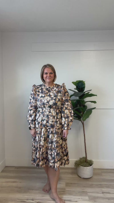 The Mason Midi is your new go-to for effortless charm! This long sleeve dress features a stunning charcoal gray base adorned with mustard floral details that pop. Playful ruffled tiers cascade down the bodice, while a charming ruffle collar, cuffs and ruffled shoulders add movement and personality. The elastic waist and cuffs ensure a comfortable, flattering fit, and practical seam pockets keep your essentials close. A keyhole closure at the neckline adds a sweet finishing touch, while the fully lined construction provides coverage and confidence. Perfect for anyone who loves modest style with a dash of whimsy!