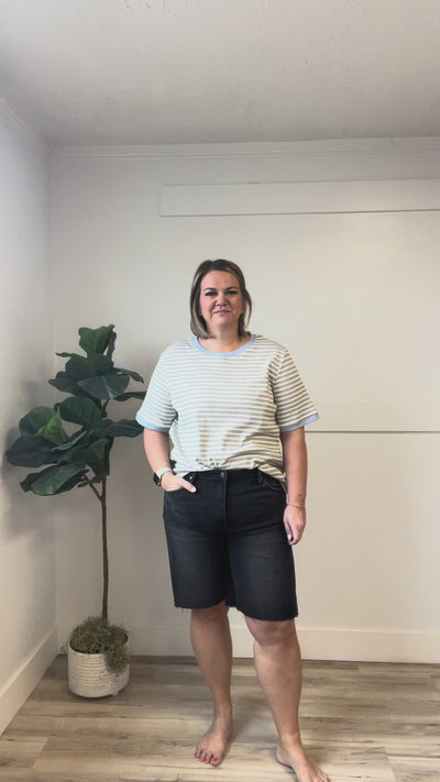 Elevate your casual wardrobe with these Miami Bermuda Shorts, designed for effortless style and comfort. The high-rise cut flatters your silhouette while the Bermuda length offers versatile coverage that works for any season. Raw hem detailing adds an on-trend, relaxed edge to your everyday look. Choose between classic dark denim wash or sleek black to match your personal style. Perfect for pairing with everything from fitted tees to oversized tops, these straight, slightly wide leg shorts deliver the perfect balance of sophistication and laid-back charm.