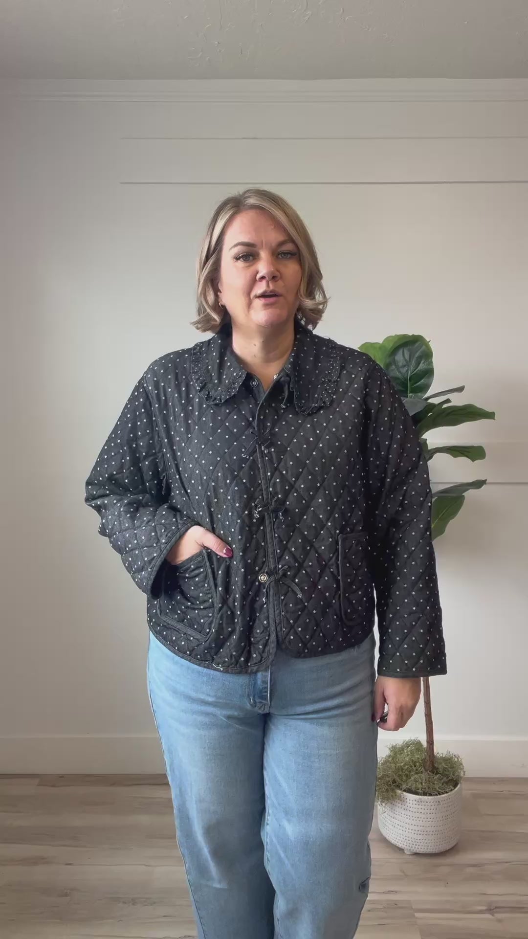 The Miley Jacket blends classic charm with modern style. Crafted from black denim with a cozy quilted texture, it features playful white polka dots and a delicate ruffle trim on the Peter Pan collar. The snap-up front with decorative ties adds a feminine touch, while practical patch pockets. Perfect for layering, this jacket effortlessly elevates any outfit with a unique, stylish edge.