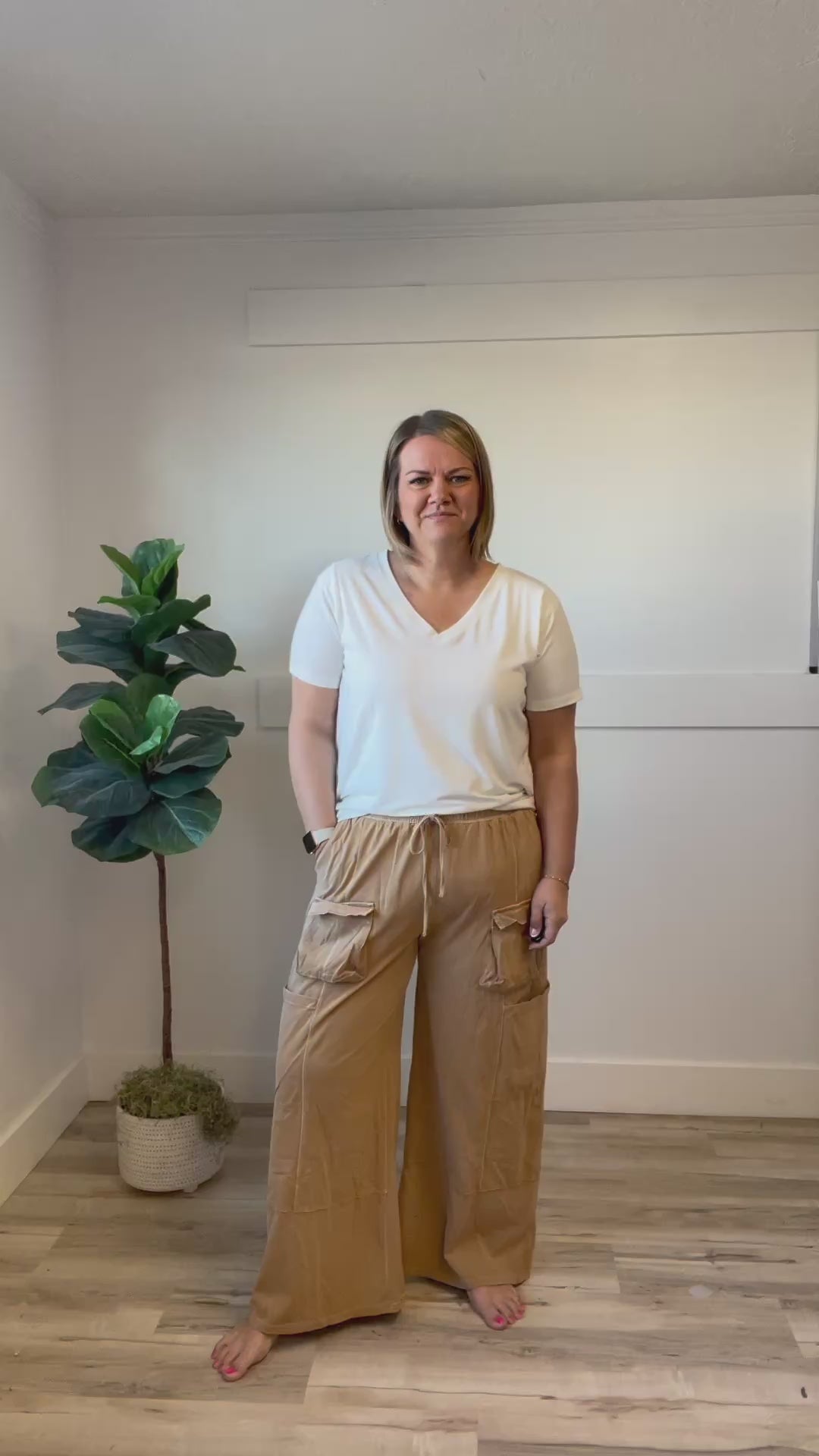 Bring effortless cool to your wardrobe with the Mina Cargo Pants. Crafted from soft, stretchy knit fabric, these vintage wash camel-colored pants offer all-day comfort with an elastic waist that moves with you. The wide leg design and cargo pockets add a unique, trendy edge while keeping things practical. Perfect for lounging or stepping out with a playful vibe.
