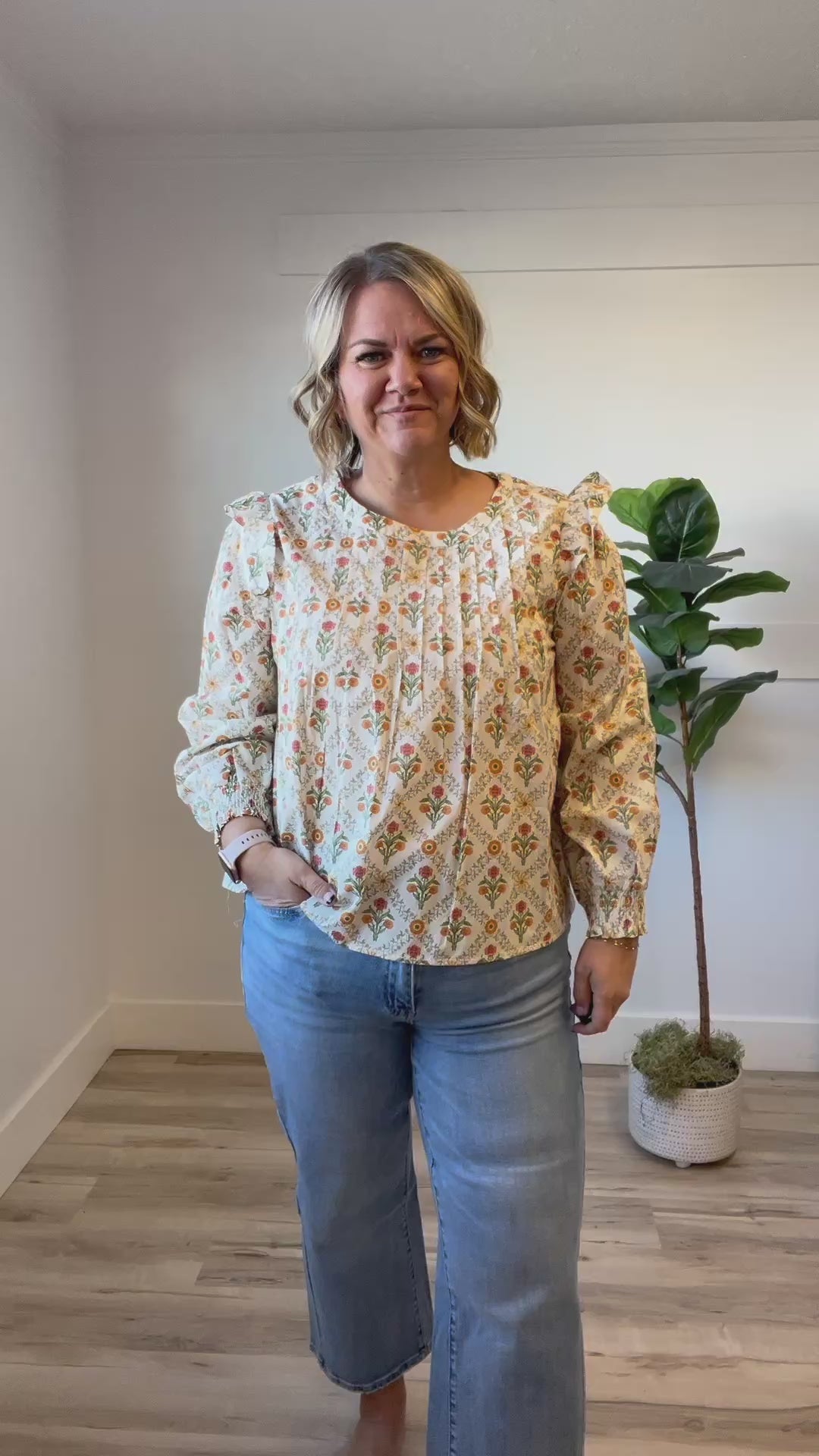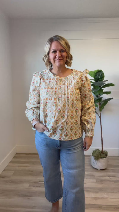 The Mindy Floral Top brightens your look with its vintage-inspired rust and orange florals set against a charming trellis pattern. Long sleeves with elastic cuffs keep it comfy, while playful ruffles at the shoulders add a sweet touch. Its straight hem and unique design make it a fun and fresh choice for any occasion.