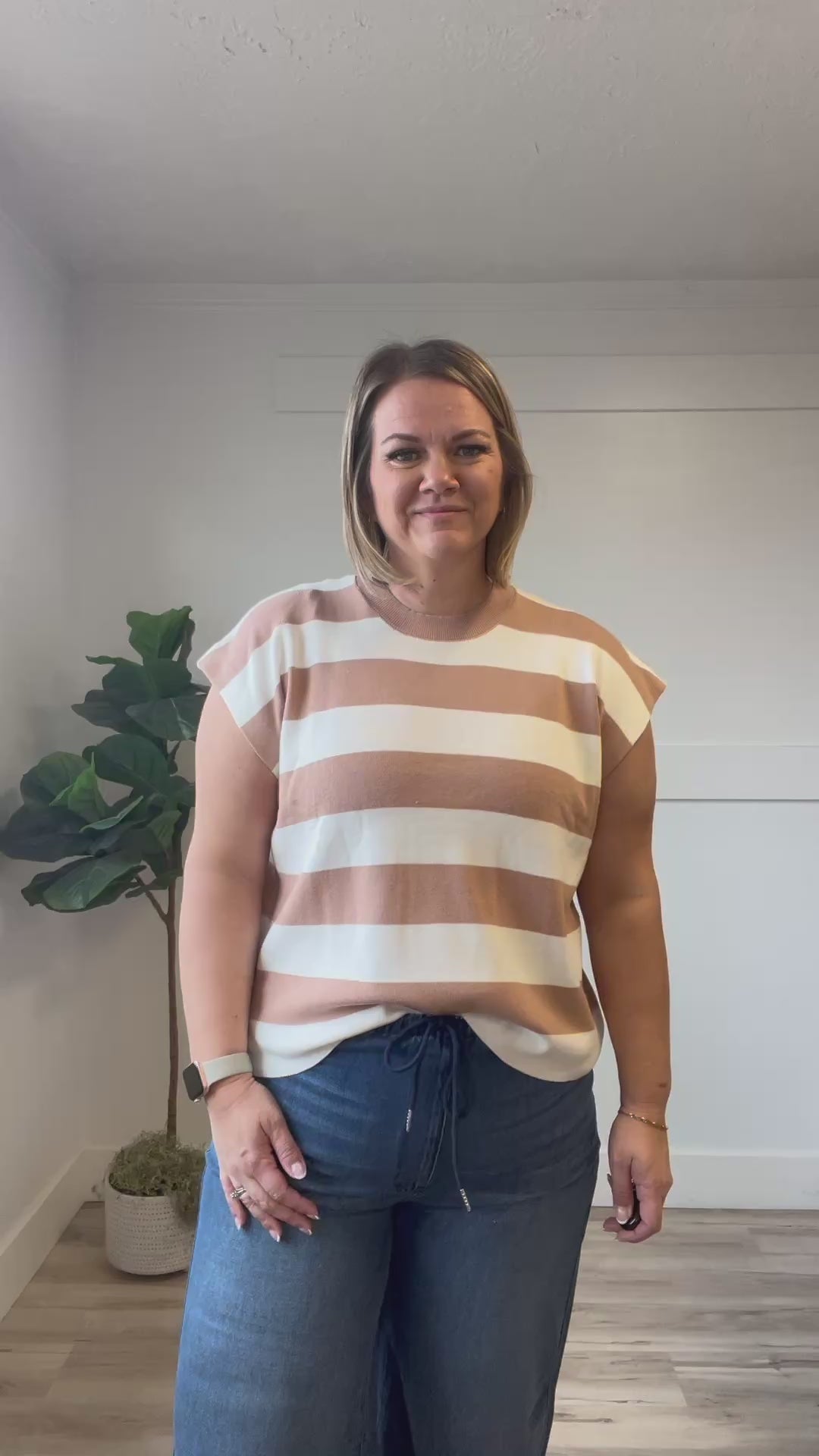 The Ori Top is a versatile knit sweater featuring soft, breathable fabric in a taupe and white stripe pattern. With its boxy silhouette and short cap sleeves, this piece works beautifully layered under a jacket or worn solo. The relaxed fit offers comfortable everyday wear while maintaining a polished, modest aesthetic. Perfect for building effortless outfits year-round.
