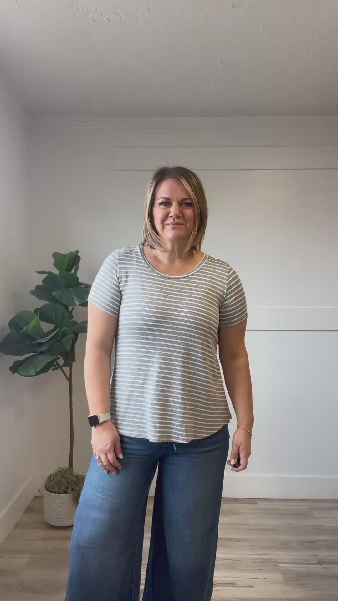 The Peyton Top features a classic short sleeve design with a gentle scoop neckline, perfect for every day. Crafted in soft fabric in heather gray and white stripes, this versatile piece offers timeless style with everyday comfort. The rounded hemline adds a flattering silhouette that works beautifully with your favorite bottoms.