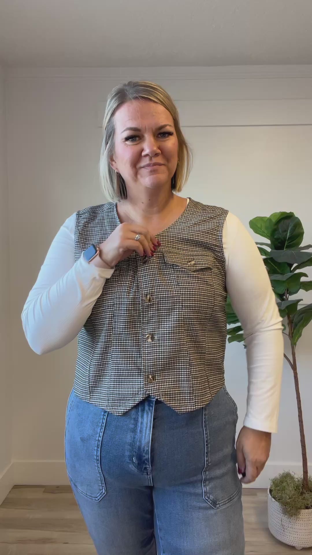 The Phoenix Vest showcases a classic black and tan houndstooth pattern with a sleek V-neck and button-up front for easy layering. Its fitted silhouette is enhanced by darts and detailed seams, creating a flattering shape. Two breast pockets add both style and practicality, while the classic hem—straight in back with pointed fronts—adds a dressy flair. Perfect for elevating any look with timeless sophistication and tailored style.