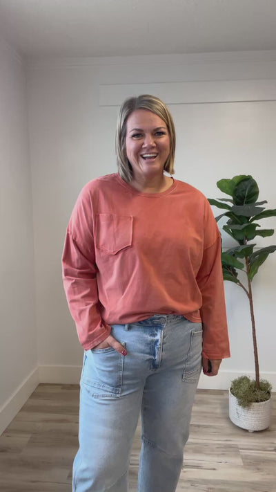 The Rhett Top combines cozy vintage charm with a splash of pumpkin orange fun. Featuring long sleeves and a relaxed drop shoulder fit, it’s perfect for layering or rocking solo. A round neck and handy pocket add everyday ease, while raw edge details bring a playful, effortlessly cool vibe to your look.