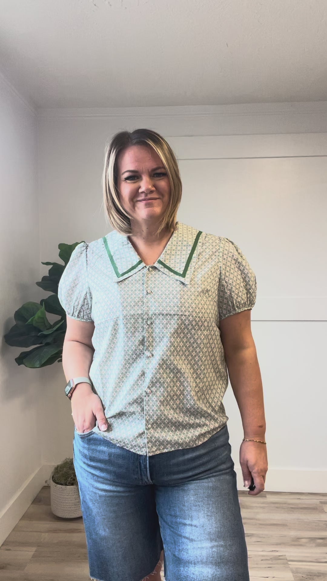 The Riley Top combines vintage charm with modern comfort. This seafoam green button-up features a striking large sailor collar and open V-neckline for a flattering silhouette. Delicate ribbon trim and fabric-covered buttons add nostalgic details, while puff sleeves bring playful dimension. The straight hem and short sleeves make it perfect for layering or wearing solo. An effortlessly elegant piece that captures timeless style.