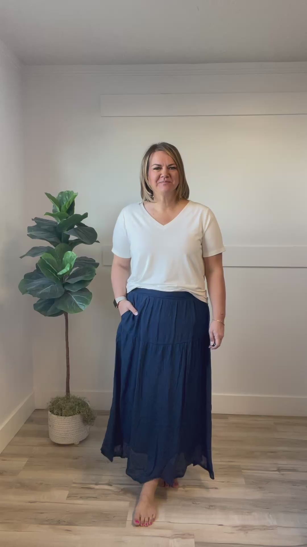 Not your average navy skirt, the Rosa Midi Skirt combines understated elegance with everyday wearability. Crafted from lightweight, slightly sheer textured fabric, this navy beauty features a comfortable elastic waist and structured yoke for a flattering silhouette. The flowing skirt is fully lined for confidence and movement, while the on-trend sweetly scalloped hem is adorned with delicate crochet trim that adds a touch of feminine sophistication. Whether you're heading to brunch or a casual dinner, this versatile piece effortlessly transitions through your day with grace and style.
