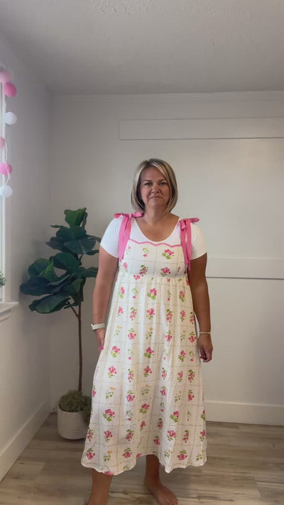 The Sally Midi features a charming pink floral tile pattern set against a crisp white background. This elegant dress showcases a delicate scalloped neckline that frames the shoulders beautifully, while adjustable tie straps allow you to customize the fit to your preference. The smocked back detail adds texture and gentle shaping for a flattering silhouette. Perfect for spring gatherings, garden parties, or any occasion calling for modest, feminine style.