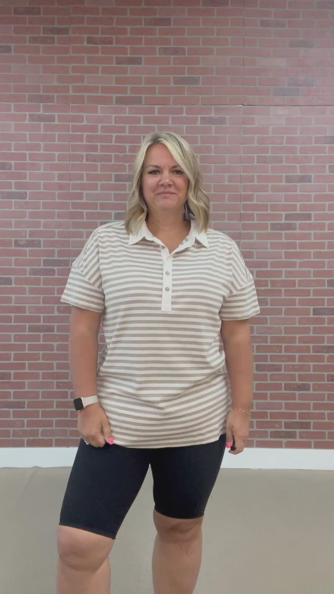 Elevate your wardrobe with the Saylor Top! Designed with taupe and oatmeal stripes, this oversized top exudes effortless style. The collar and half button-up front lend a touch of sophistication, while the short sleeves and drop shoulder provide comfort. The contrasting collar and placket add chic details, and the side slits create a flattering silhouette.