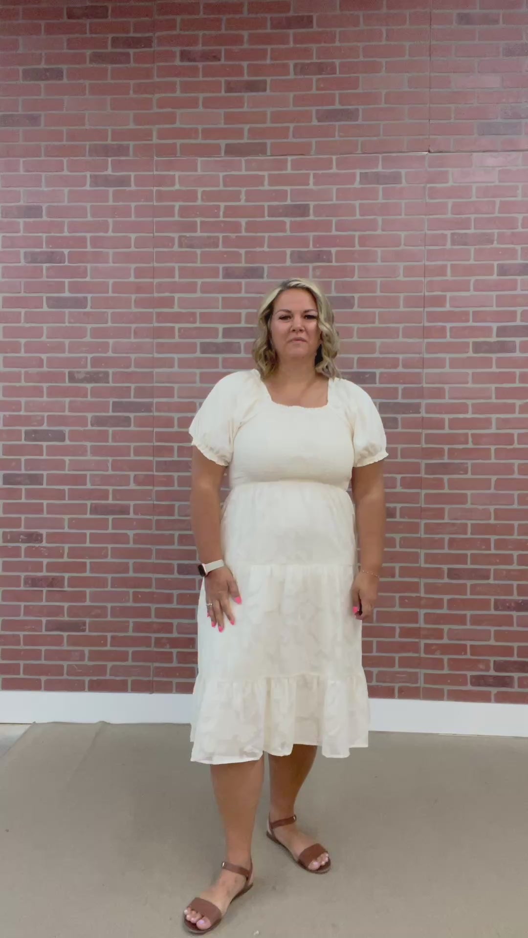 Indulge in the ethereal beauty of the Sherelle Midi dress. The cream tone-on-tone florals of the sheer overlay create a delicate and feminine look, accented by a tiny ruffle along the elastic square neck. The smocked bodice, tiered skirt and self-tie back provide a flattering fit, while the elastic cuff short puff sleeves and full lining ensure all-day comfort. Perfect for any occasion, this dress exudes elegance and grace.