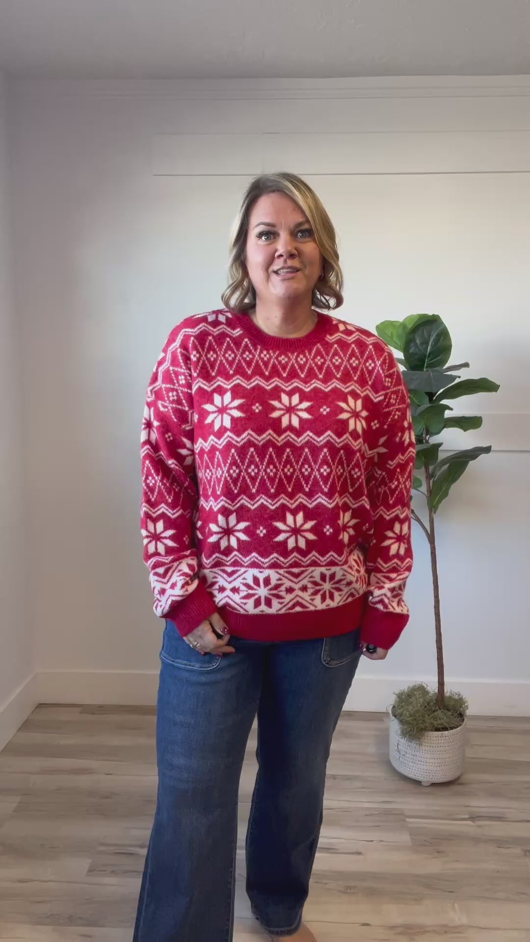 Stay cozy and cheerful in the Skadi Sweater, a playful blend of fuzzy softness and festive charm. Its classic red knit features delightful white snowflake designs that bring winter magic to your look. Perfect for chilly days, this long sleeve, drop shoulder sweater wraps you in warmth while spreading holiday spirit wherever you go.
