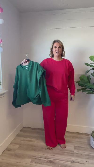 Get cozy with the Stormi Set, featuring a soft long sleeve top with playful raglan sleeves for easy movement. The wide leg pants come with an elastic waistband and seamless pockets, making comfort and style your new go-to combo. Perfect for lounging or casual days, this set is all about relaxed vibes and effortless charm. Available in classic red or dark green.