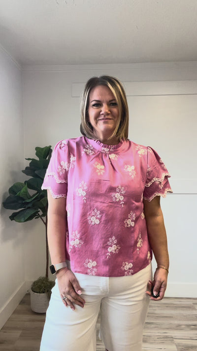 The Taite Top features a charming pink base adorned with sweet white embroidered florals. This short-sleeve style showcases a round neckline with a small ruffle detail and a functional keyhole closure at the back. Double-layered sleeves with scalloped edges add feminine dimension, while the straight hem creates a polished silhouette. Perfect for layering or wearing solo, this versatile piece brings effortless elegance to any modest wardrobe.